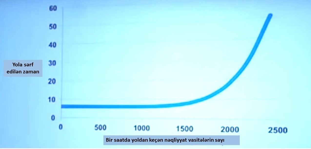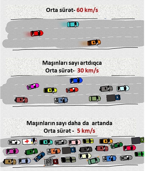 Avtomobil yolunun bir xüsusiyyəti var: yola çox maşın çıxırsa nəqliyyat axının sürəti qeyri proporsional düşür. Yəni hərəkət iştirakçılarının sayı artdıqca yolun səmərəliyi kəskin düşür. Bunu aşağıdaki şəkillə izah etmək daha rahatdır: