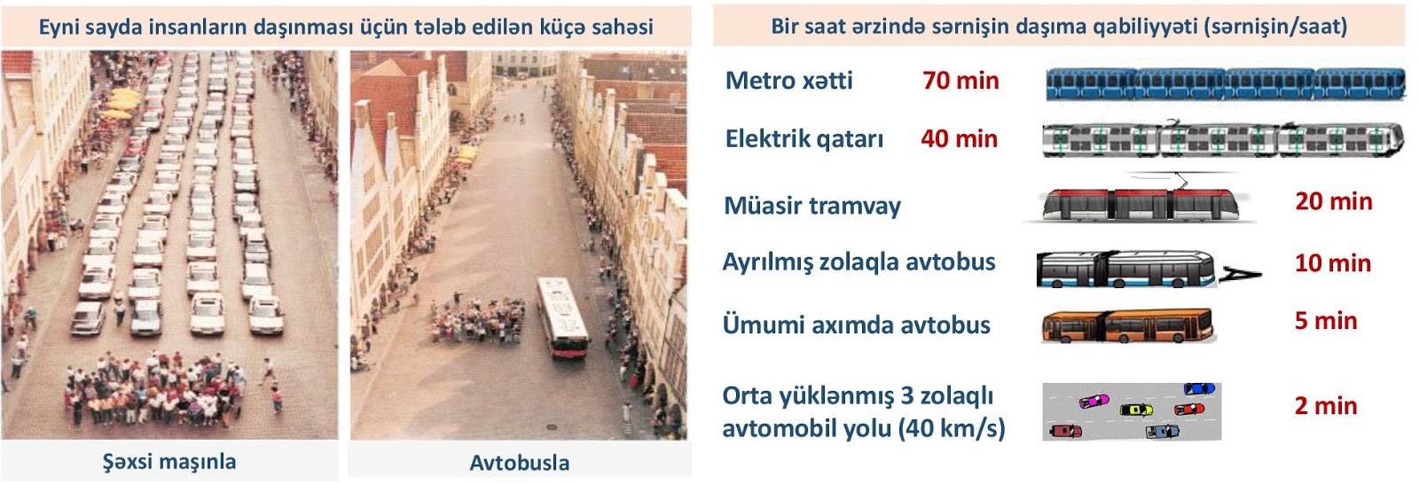 - Müasir tramvay çox səmərəli şəhər nəqliyyatı növüdür. Bu nəqliyyat növü məhdud küçə və yol şəbəsəkini inanılmaz dərəcədə daha səmərəli istifadə edə bilir. Belə ki, əgər bir avtomobil zolağı bir saat ərzidnə, ən ideal halda 1000-1200 sərnişin daşıya bilirsə, müasir tramvay tərəfində istifadə edilən bu zolaq 20 min sərnişin daşıya bilir. Qeyd etmək lazımdır ki, şəhərin nəqliyyat funksiyası nəqliyyat vasitələrəni maksimum sayını deyil, məhz insanların daşınmasını hədəfləyir.